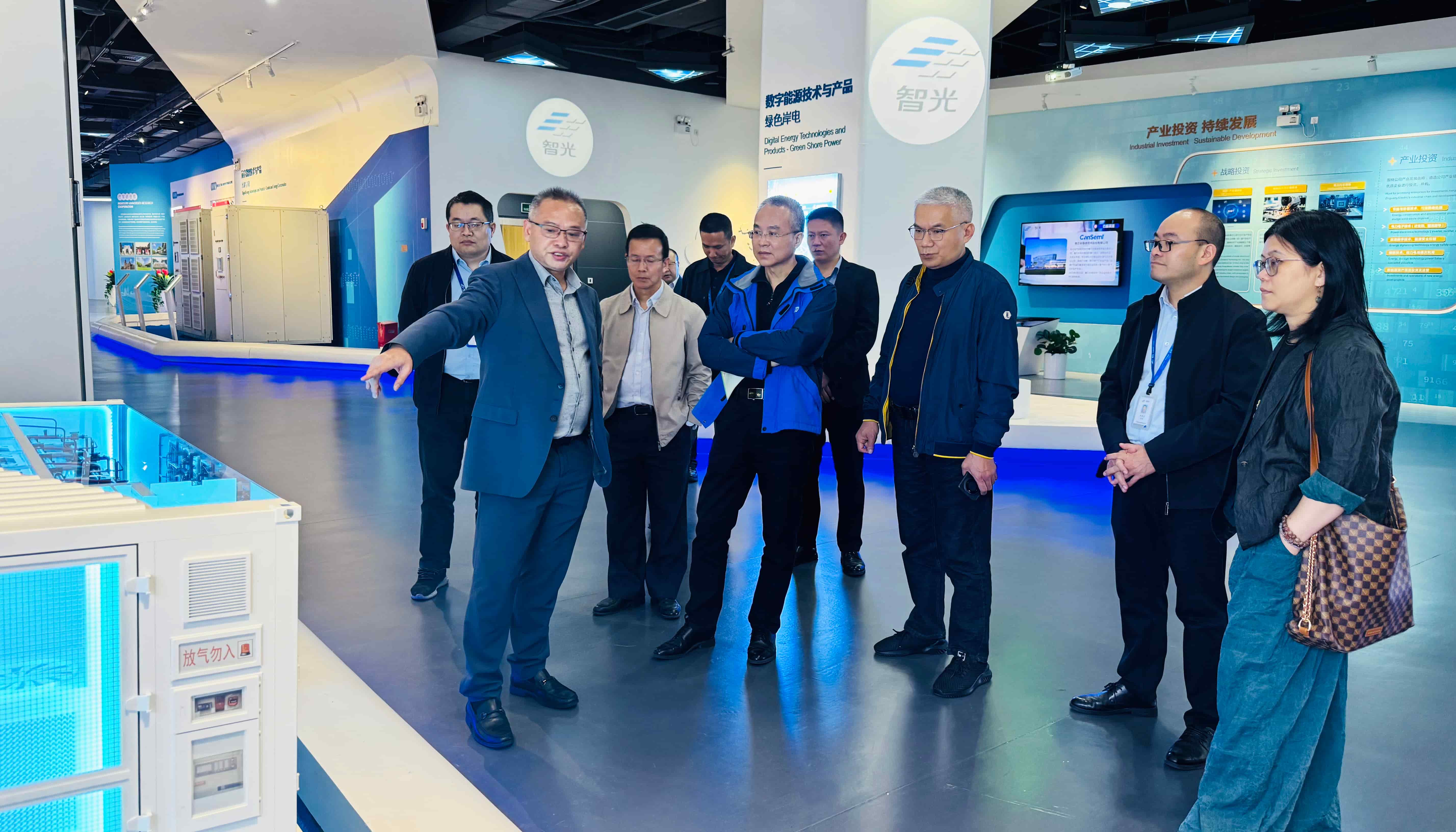 随后,嘉宾一行前往智光综合能源产业园,参观园区展厅,详细了解智光电气在综合能源服务、储能系统集成和电力数字化等领域的技术成果、项目案例及产业布局,进一步加深了对智光电气在新型电力系统建设中的技术积淀、创新能力与实践经验的全面认知。